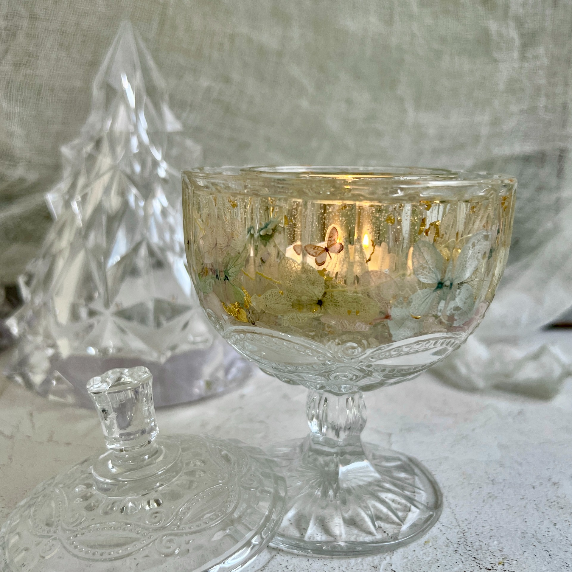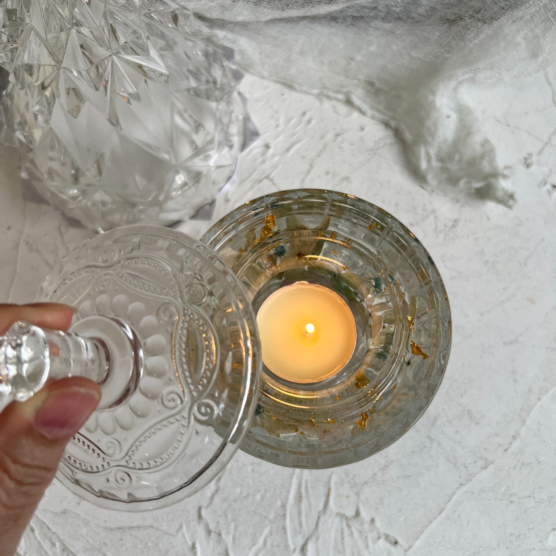 利用果凍蠟的透明特性,交織出花材與燭光間斑駁陸離的光影,無論是放在家中還是送禮,都超級加分!完成的作品是一個精緻的燭台,搭配一般茶蠟就能立即使用,